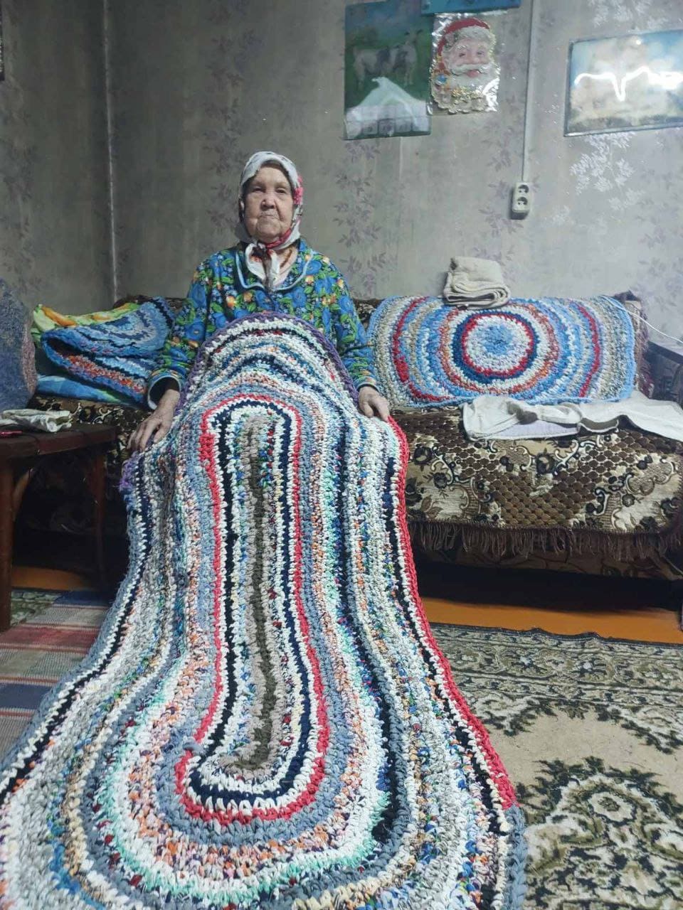 Обслуживаемая отделения социального обслуживания на дому Козлова ВА вяжет вот такие прекрасные коврики!